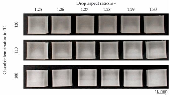 After further inspection of the cubes, it was observed that the drops did not weld together sufficiently. This insufficient welding had to be improved by increasing the energy input. Thus, the temperature of the building chamber was increased to 120 °C. Increasing the build chamber temperature led to a better appearance, but the welding was still not good enough. Therefore, the temperature of zone 1 was increased from 195 to 200 °C and the temperature of zone 2 from 225 to 230 °C. Also, the nozzle temperature was increased from 240 to 245 °C to decrease the process pressure. The cubes produced with the increased temperatures still showed warping and tapered edges regardless of the DAR used. Thus, the new strategy was to decrease the building chamber temperature from 120 to 100 °C, and the drop overlap from 50 to 25%. The resulting print jobs for all chamber temperatures and DARs are given in Figure 5.
