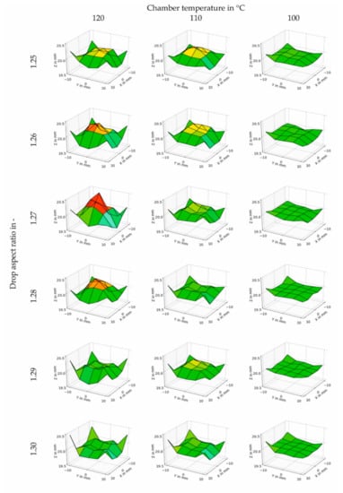Surface plots of the height measured for cubic specimens printed at different chamber temperatures between 120 and 100 °C and different drop aspect ratios between 1.25 and 1.30. Other processing temperatures were T1 = 200 °C, T2 = 230 °C, and Tnozzle = 245 °C.