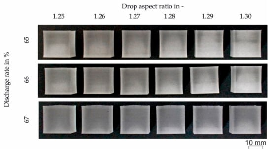 Cubic specimens printed at different discharge rates (65, 66 and 67%) and drop aspect ratios between 1.25 and 1.30. Other processing temperatures were T1 = 200 °C, T2 = 230 °C, Tnozzle = 245 °C, and Tchamber = 100 °C.