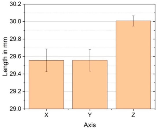 Since thermoplastics shrink after fabrication, this shrinkage has to be compensated by using a scaling factor in the slicing software. For this purpose, five cubes 30 mm × 30 mm × 30 mm were printed individually using the final values shown in Table 2. The dimensions of the specimens were measured in the three axes (Figure 8). It was found that there was anisotropic shrinkage with the cube shrinking more in X- and Y-direction. Therefore, scale factors for each of the directions were calculated: X-direction = 1.015, Y-direction = 1.015, and Z-direction = 1.00 to improve the geometrical accuracy of the printed specimens.