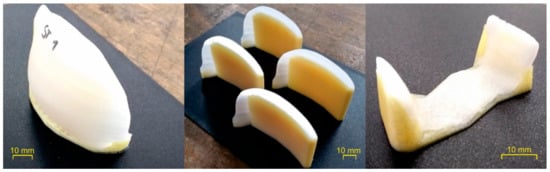 Tensile specimens and other geometries such as possible cranial or dental implants were printed using the optimized values of the processing parameters (i.e., “PMMA final values” in Table 2). Examples of such printed specimens are shown in Figure 9. The quality of the printed geometries was considered acceptable based on their appearance, but further characterization on the parts to determine their mechanical performance, internal microstructure, bio-compatibility, and long term stability is ongoing and will be reported in future publications.