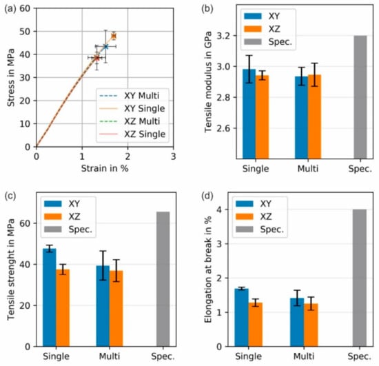 Tensile mechanical properties of printed specimens in two orientations (XY and XZ) and the batch of one specimen (Single) or five specimens (Multi): (a) stress-strain curves, (b) tensile modulus, (c) tensile strength, and (d) elongation at break. Specifications (Spec.) for the neat (most likely injection molded PMMA) given by the producer are given for comparison. Individual stress-strain curves can be seen in the Supplementary Information (Figure S1).