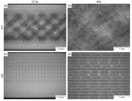 Microscopy images of tensile specimens printed in (a,b) XY-orientation or (c,d) XZ-orientation recorded at two different magnifications (12.5 and 40). All images were taken from the top view and laying the specimens in the XY-plane.