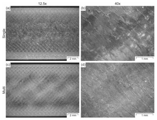 Microscopy images of tensile specimens printed in (a,b) batch of one specimen (Single) or (c,d) five specimens (Multi) recorded at two different magnifications (12.5 and 40). All images were taken from the top view and laying the specimens in the XY-plane.