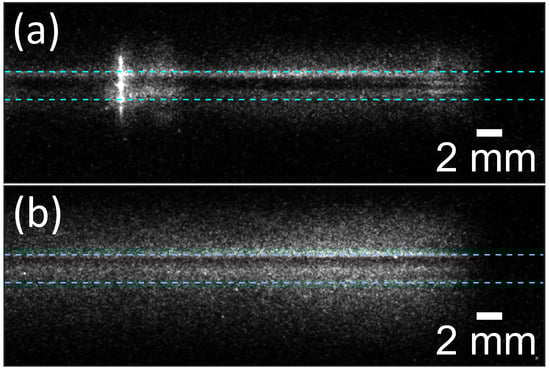 The single-shot images of the discharge half-period of the discharge generated in the nitrogen-monomer mixture: (a) transient homogeneous-filamentary regime; (b) homogeneous regime without filaments. The dashed blue lines indicate the position of the surface of the dielectric plate covering the upper electrode, and the position of the bottom electrode, which is covered by the glass substrate.