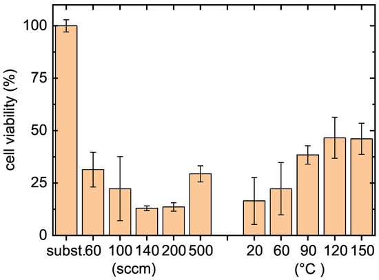 In vitro cytocompatibility results of tested POx films deposited at different substrate temperatures and at different flow rates through the monomer. Left side of graph—films deposited at different flow rates through the monomer; right side of graph—films deposited at different substrate temperatures.