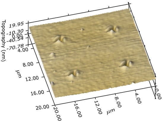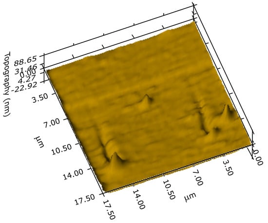 The viscoelastic behaviour of the film may be characterised using the storage modulus , loss modulus and loss factor . The storage modulus , which is the measure of the energy stored and recovered during the loading period, was (26 ± 2) GPa and the loss modulus , which is the measure of the energy dissipated in the studied material during the loading period, was (1.4 ± 0.2) GPa. The loss factor , which is the measure of the viscoelastic behavior of materials [] was 0.045 ± 0.005. The studied film exhibited relatively low value indicating a predominantly elastic behaviour (low damping) of the film material. The surface topography of the studied film is shown in Figure 6.