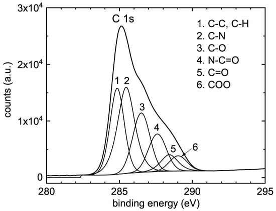 The nitrogen content in the POx film increased and the carbon content decreased compared to nitrogen and carbon content in 2-ethyl-2-oxazoline. However, the nitrogen content is almost two times lower than nitrogen content in POx films deposited from 2-methyl-2-oxazoline at the same deposition conditions []. This fact could explain lower cytocompatibility of POx films deposited from 2-ethyl-2-oxazoline, because better cytocompatibility was observed at nitrogen rich surfaces []. A detailed analysis of the high-resolution C1s peaks provided additional information on the chemistry changes on the surface during the film deposition process. The C1s peak of POx film was deconvoluted into six components corresponding to C-C/C-H (284.7 eV), C-N (285.4 eV), C-O (286.3 eV), N-C=O (287.7 eV), C=O (288.2 eV) and COO (289.1 eV) bonds, see Figure 8.