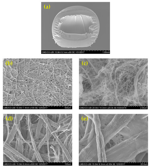 Figure 2 showed the structure of the MFC-NFC-CMC 3D matrix sample. Morphological differences in the network were observed. It was also possible to visualize the spherical shape of the delivery systems (Figure 2a). These systems were cut, using a new, single-use blade in order to evaluate their internal matrix. The alginate, together with the divalent ions of the CaCl2 solution, formed a cross-linked structure where the molecules are physically trapped inside the matrix, able to migrate to the surrounding environment. For this reason, alginate as a crosslinking agent has often been used to produce DDS. The alginate gelation, through dripping in a solution containing Ca2+ ions, allows the formation of spherical DDS with regular shapes and sizes and a smooth surface, which can delay the release of the incorporated active substances [31]. The MFC matrix structure (Figure 2b) presented a uniform, intercalated, open and porous matrix, in microscale. The NFC matrix structure (Figure 2c) presented as a biomaterial with a porous, multi-structured 3D matrix, in the nanoscale. The combination of MFC and NFC allowed the production of a multi-structured hydrogel, capable of retaining and releasing therapeutic molecules. The combination of these biomaterials with CMC additive (Figure 2d,e) also allowed the inter-fiber bonding, with a more closed structure. Our previous studies have allowed us to conclude that the addition of CMC in nanocellulose matrices modifies its hydrophilicity, resulting in DDS with greater affinity for water, as it has more OH groups available for its interaction and intermolecular interactions with the surrounding environment [16]. For this purpose, we also used CMC as an additive in order to increase the affinity with water and control the release of therapeutic molecules from DDS. For the design of an innovative material used as an internal 3D matrix in DDS, we propose this combination of cellulose-based 3D structures, where the porosity and pore distribution has been controlled to obtain the desired release of molecules.