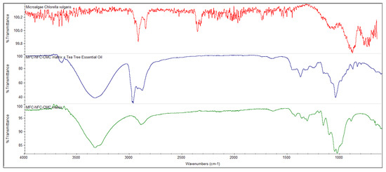 Fourier-transform infrared spectroscopy (FTIR) spectrum of microalgae Chlorella vulgaris (red) and MFC-NFC-CMC 3D matrix with tea tree essential oil (blue) and without tea tree essential oil (green).