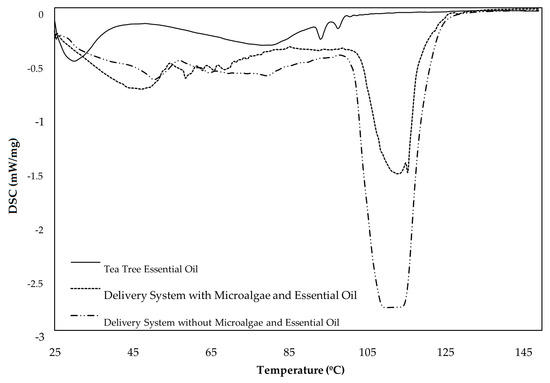 Comparison of DSC of the delivery systems containing the polymeric matrix and the tea tree essential oil, with and without microalgae Chlorella vulgaris, and the tea tree essential oil alone, which was not incorporated in the polymeric 3D matrix.
