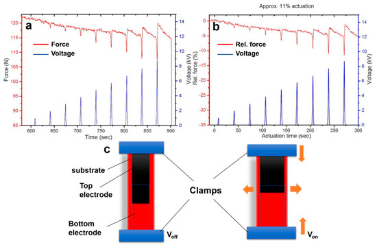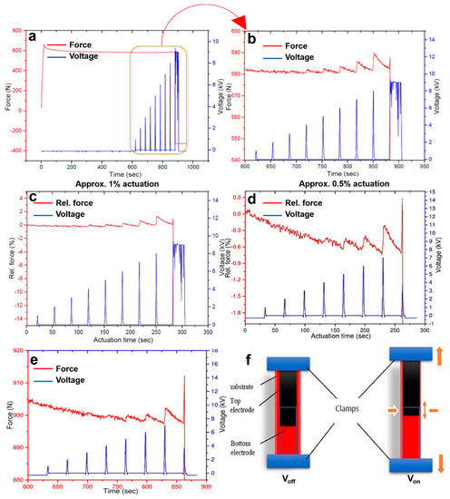 Figure 2. (a,b) Actuation profile of NBR 1846 F at 30% prestrain; (c) Actuation in terms of relative force (NBR with 30% prestrain) (d,e) Actuation profile of NBR 1846 F at 50% prestrain in terms of relative force (abbreviated as Rel. force, %) and force (N), respectively; (f) schematic illustration of actuation in voltage off and voltage on condition.