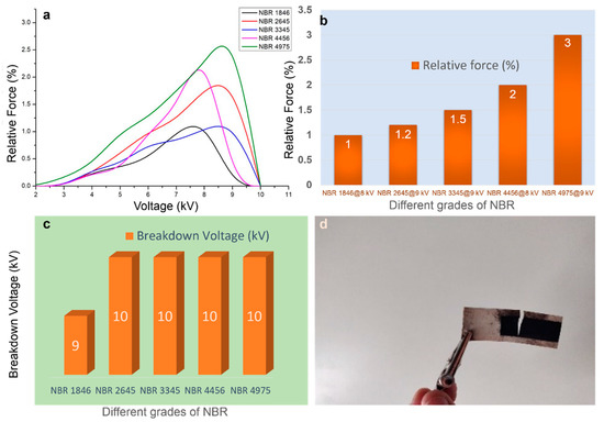 Figure 3. Effect of ACN content on actuation performance of NBR composites: (a) relative force (%) for various NBR grades as a function of voltage, (b) maximum actuation for different grades of NBR substrates; (c) breakdown voltages of different NBR grades, and (d) photograph of sample after testing.