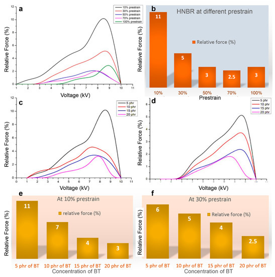 Figure 5. (a) Effect of prestrain on actuation performance of HNBR substrates; (b) maximum actuation of HNBR at different prestrains; effect of barium titanate (BT) concentration (phr) on the actuation performance (relative force (%) as function of voltage) at (c) 10% prestrain and (d) 30% prestrain; (e,f) the histogram representation of the actuation as a function of BT concentration at 10% and 30% prestrain, respectively.