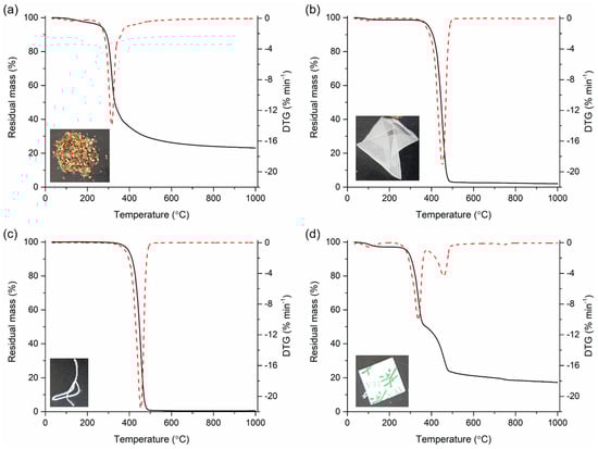 TG and DTG curves of components of the TBW: (a) biomass; (b) plastic bag; (c) thread; and (d) paper.