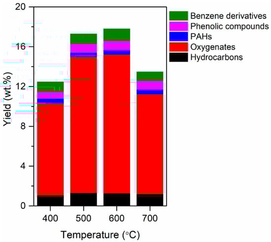 As shown in Figure 3, the yield of phenolic compounds, benzene derivatives, and PAHs increased with an increase in temperature from 400 to 600 °C. Benzene derivatives and phenolic compounds are more easily transformed into PAH derivatives at higher temperatures, and the formation of PAHs favors high temperatures [41]. A further increase in the temperature from 600 to 700 °C decreased the yields of benzene derivatives, phenolic compounds, and PAHs, likely due to enhanced thermal cracking of those compounds.