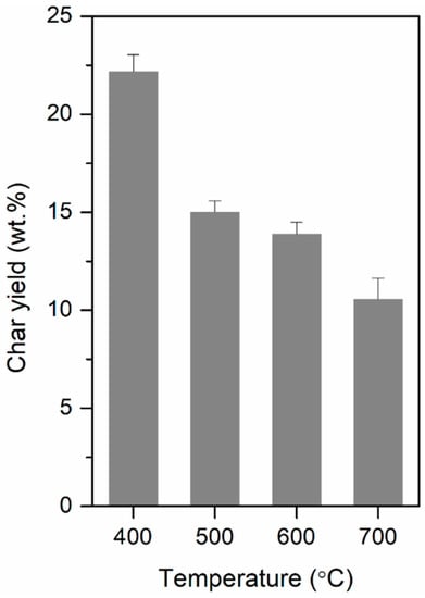 The yield of the nonvolatile carbon-rich solid remaining after the pyrolysis of the TBW (i.e., char) at different temperatures is shown in Figure 4. The yield of the char was the highest at 400 °C and decreased with an increase in the pyrolysis temperature. The decrease in the char yield was likely due to the enhanced cleavage of –OH and C–H groups at temperatures higher than 400 °C [44] which releases more volatile compounds from the feedstock [45], thereby decreasing the yield of the char.