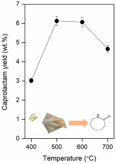 Figure 5 shows the yield of caprolactam obtained from the pyrolysis of TBW conducted between 400 and 700 °C. The caprolactam yield increased from 3.1 to 6.2 wt.% as the temperature increased from 400 to 500 °C. However, a further increase in the temperature from 500 to 700 °C decreased the yield from 6.2 to 4.6 wt.%. This may be because the caprolactam is thermally decomposed at temperatures higher than 500 °C. Considering that the caprolactam originated from the non-biomass part of the TBW (Figure S1 and Table 1) via its depolymerization, and the caprolactam yield of 6.2 wt.% was on the basis of the weight of the whole TBW (i.e., both the non-biomass and biomass part), the caprolactam yield corresponds to 59.2 wt.% on the basis of the weight of the non-biomass part of the TBW.