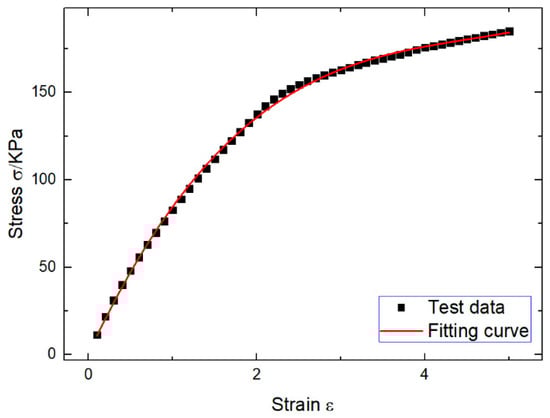 Monotonic results of the stress-strain behavior of the uncured rubber compound are shown in Figure 4. The empirical equation can be obtained by cubic fitting of the obtained stress-strain curve, which is more accurate than the quadratic fitting. The model is in good agreement with the actual test data and can be directly used as the dynamic force and strain testing equation at fixed temperature and frequency.