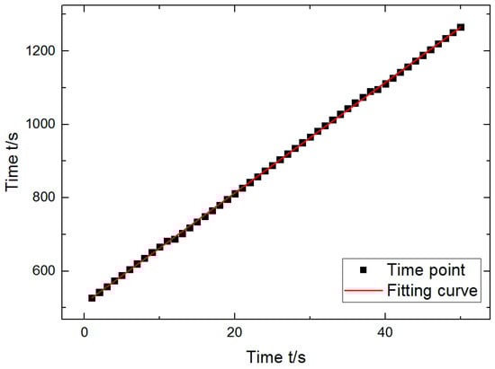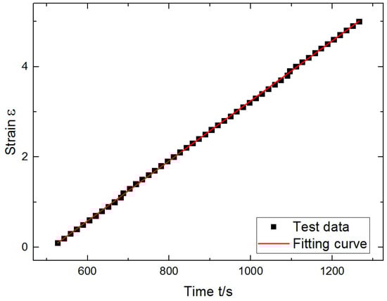 During the test, since the experiment started from the clamping of the sample and the pre-loading stage, it was necessary to determine the initial time of the stretching experiment, namely, the time zero point. According to the Burgers model, at the moment of force application, only spring 1 will be deformed due to the action of sticky pots. According to Hooke’s law, the elastic constant E 1 can be obtained by using the numerical value of this moment. Therefore, it is very important to determine the time zero point when the force applied to the sample begins. However, there may be a time lag due to the timing of the experimental instrument at the beginning of the experiment. Therefore, the first timing point in the experimental data was set as the corresponding point at the beginning of stretching for 1 s to improve the accuracy. The software Origin was used to take the measured time as the Y-axis, and the time axis starting from 1 was the X-axis for fitting (Figure 6). Thus, the required time zero point t0 was obtained ( t 0 = 512.14   s ).
