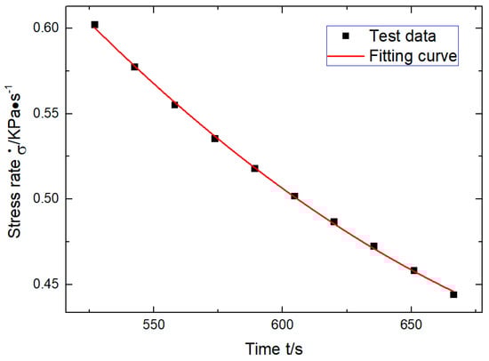 Because the empirical equation of the stress-strain data was obtained by cubic fitting, the stress rate and strain rate needed to be fitted quadratically. Using Origin and taking the first 10 data of the stress rate obtained from Equation (7) at the beginning period of ε 1 % , the quadratic fitting was carried out and extended to the time zero, and the following formula was obtained (Figure 7).