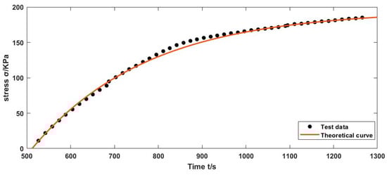 According to the parameters and initial conditions determined by Equation (4) in Section 3.1, Section 3.2 and Section 3.3, the Simulink simulation (Figure 9) was put in place to obtain the comparison between the stress-time theoretical curve and the testing data. The initial values were ε ˙ = 0.0066 , σ ˙ 0 = 0.624   KPa / s , σ 0 = 0   K P a , t 0 = 512.14   s .