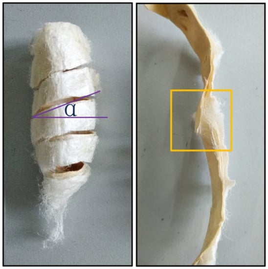 The E cocoon could be divided into 5–9 layers, forming three parts called cocoon coat, cocoon layer, and cocoon lining, which had considerable variation in properties, as can be seen from Table 2. The thick and loose cocoon coat bulging like a fin on one side of the cocoon accounted for approximately 21% of the total weight of the cocoon. The cocoon coat and the cocoon layer had no obvious boundary, and there were a large number of discontinuous static air gaps between them, as can be seen from Figure 4d, which provides the cocoon with excellent thermal insulation and impact resistance [6,23]. The cocoon layer was in loose contact with the cocoon coat but in very tight contact with the cocoon lining, which accounted for about 71% of the weight of the cocoon and had a relatively compact structure, providing the most protection for larvae. The cocoon lining was paper-like with dense structure, which accounted for approximately 10% of the total weight of the cocoon. The cocoon lining actually constituted a “closed” cavity supporting larvae activity. The cocoon coat had high sericin content and moisture regain, but the cocoon layer had high strength and low elongation.