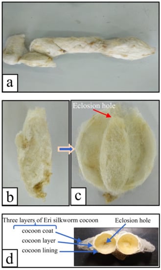 Cocoon is a type of unique and important biopolymer composite in nature with excellent microstructure and ecological functions. Cocoons of different shapes and structures are formed in a programmed manner through the regular swing of the head and the cyclical bending and stretching of the body to adapt to different environments [1]. The process of silk spinning and cocoon construction has undergone long-term natural selection and extensive evolution. Although cocoons are thin and lightweight, they can protect silkworms from various invasions in nature and provide a good place for silkworm metabolism [2,3,4]. Silk from Bombyx mori (mulberry silkworm) has been the most commonly used silk for centuries [5]. However, wild varieties, such as eri silkworms, have been partially domesticated for commercial applications [3,4,6]. Eri silkworms are the third largest silkworms in the world after Bombyx mori and tussah. They have only half the life cycle of Bombyx mori but construct bigger cocoons than Bombyx mori [2]. Eri silkworms are highly adaptable multifood silkworms that feed on leaves from several trees (castor leaves, cassava leaves, crane leaves, stinky leaves, pine leaves, cypress leaves, and so on) and are therefore easier to rear compared to Bombyx mori, which can be only fed on mulberry leaves [7,8,9]. Although the annual production of commercial E cocoons has reached tens of thousands of tons, there has not been much research on them. Due to the existence of eclosion hole and the loose structure of E cocoons, it is not possible to use traditional silk equipment to produce continuous filament to develop high-grade silk products, which limits their application [10]. Earlier studies have mainly focused on the breeding of eri silkworms as well as the biological structure, gene sequence, properties, and application of eri silk [1,11,12,13,14]. It has also been reported that the proteins generated by eri silkworms have antimicrobial activity [15]. Due to its excellent properties of moisturizing, antioxidation, and antiaging, silk protein has been widely used in nonwoven fields, such as cosmetics and biomedicine, in recent years [2,11].