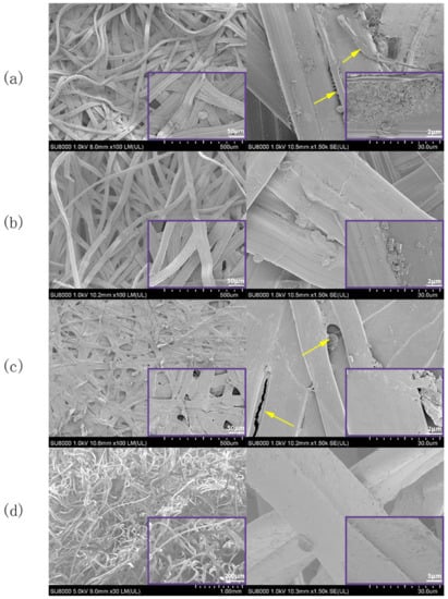 SEM images of the microstructures of E cocoon: (a) cocoon coat; (b) cocoon layer; (c) cocoon lining; and (d) outer layer of eclosion hole. The yellow arrow in Figure 5a shows microfabrils of about 1 μm in diameter. The yellow arrow in Figure 5c shows that sericin can not completely coat all silk fiber, The purple square frame (bottom right) shows a partial enlarged view.