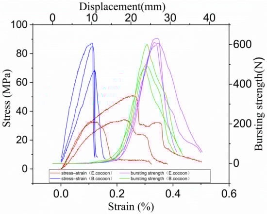 Stress–strain curves (left) and bursting strength curves (right) of the E and B cocoons.