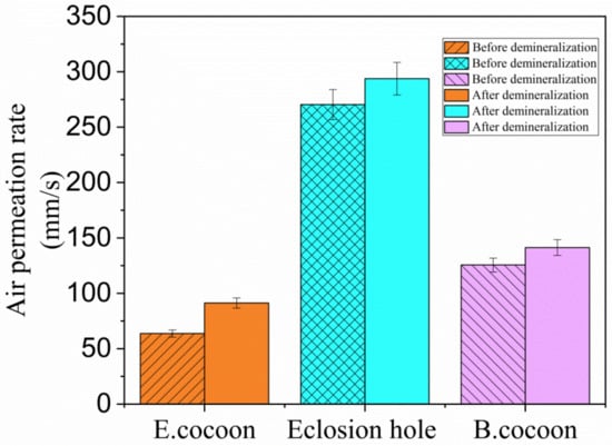 The air permeability of the E cocoon layer and the eclosion hole before demineralization were 63.698 and 270.420 mm/s, respectively (Figure 7). The air permeability of the cocoon layer and the eclosion hole after demineralization were up to 91.286 and 293.765 mm/s, respectively, which indicates that calcium oxalate crystals on the surface of fibers can affect their control ability. The presence of calcium oxalate crystals helps to reduce the penetration of external air into cocoons. The air permeability of the B cocoon before and after demineralization were 125.6 and 141.289 mm/s, respectively, which were higher than those of the E cocoon layer and lower than those of the eclosion hole. The change in air permeability of the B cocoon before and after demineralization was less than that of the E cocoon, which verifies that the content of calcium oxalate in the E cocoon is larger than that of the B cocoon [27].
