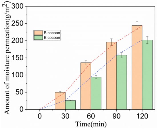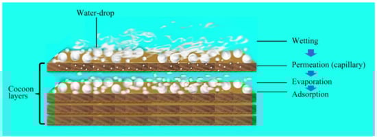 It can be seen from Figure 8 that in the initial stage (0–30 min), the moisture permeability of both cocoons was relatively low, and there was humidity difference on both sides of the cocoon layer. Water drops first wetted the surface and penetrated into the pores. The condensed liquid water was then transported to the other side of the cocoon by capillary effect (Figure 9) and evaporated into water vapor, which was absorbed by the moisture absorbent.