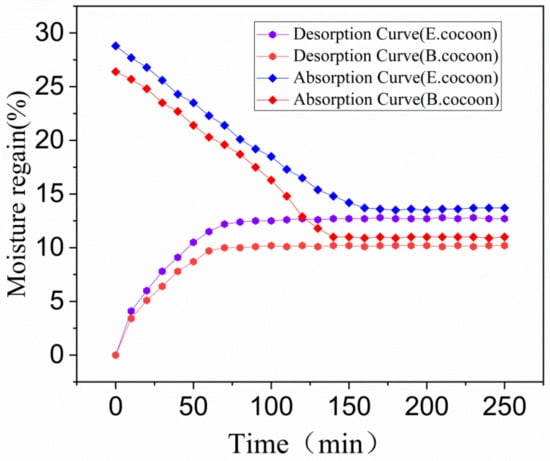 The moisture absorption and desorption curves of the cocoon in the standard state are shown in Figure 10. The balance moisture regain of absorption of the E and B cocoons were 12.7% and 10.2%, respectively, while the balance moisture regain of desorption were 13.7% and 11.0%, respectively. There was obvious absorption hysteresis, and the balance moisture regain differences caused by absorption hysteresis were about 1% and 0.8%, respectively. These values are close to cotton fiber (0.9%) and less than wool (2%). Materials with high moisture regain will have high balance moisture regain difference. Under conditions of same moisture regain, the smaller the balance moisture regain difference, the higher the absorption and desorption rate will be [32]. The moisture regain of the E cocoon was higher than that of the B cocoon, but the absorption and desorption rates were smaller than that of the B cocoon, which coincides with the moisture permeability of the cocoon. The moisture absorption of the cocoon itself makes the cocoon layer area maintain the balance of “moisture absorption and desorption”.