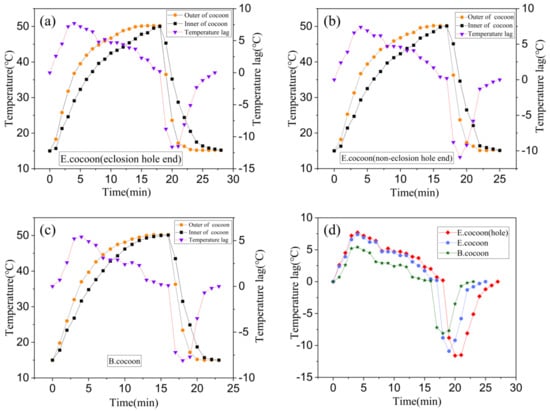 Figure 11 shows the temperature variation and temperature lag curves of locations inside and outside the cocoons when they were subjected to the process of temperature rise and fall, respectively. The temperature change inside the cocoon was slower than that outside the cocoon, indicating that the cocoon has obvious temperature buffering capability, which might be related to the natural habitat conditions that silkworms are required to defend against.