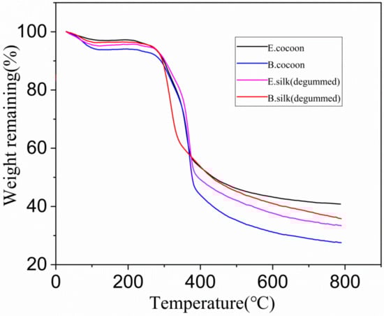 The TG curves (Figure 12) show that the E cocoon, B cocoon, eri silk, and Bombyx mori silk after degumming had similar thermal decomposition behavior. The dehydration weight loss temperatures due to the moisture content of silk appeared at 115, 116, 123 and 107 °C, respectively. The weight loss rates of water molecules were 2.7%, 6.3%, 5.1% and 3.9%, respectively. With the temperature continuing to increase, the weight loss was relatively slow. The rapid weight loss temperature ranges were 220–431, 231–454, 227–409 and 238–399 °C, respectively. The rapid decomposition interval of degumming Bombyx mori silk was small. The weight loss rates of E cocoon, B cocoon, eri silk, and Bombyx mori silk after degumming were 61%, 72%, 66% and 64%, respectively. The weight loss rate of the E cocoon was lower than that of the B cocoon, which should be related to the higher sericin content of the B cocoon and shows that he E cocoon has better thermal stability. The weight loss rate of eri silk was close to that of Bombyx mori silk after degumming.