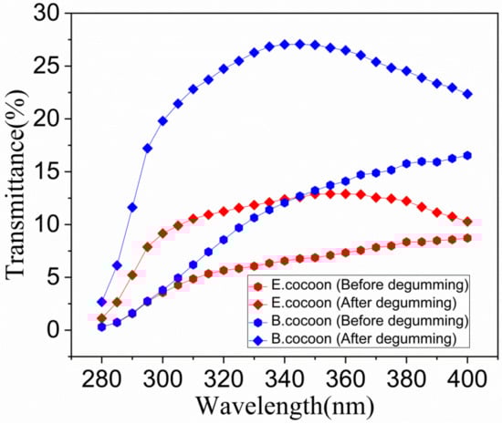 The wavelength of UV light in sunlight is between 200 and 400 nm, which is further subdivided into three main wavelength ranges, called UVA, UVB, and UVC, with wavelength ranges of 315–400, 290–315 and 200–290 nm, respectively. UVC is prevented from reaching the earth by the ozone layer in the atmosphere, while UVA and UVB can reach the surface of the earth in an amount sufficient to cause damage to living organisms. Figure 13 shows the anti UV performance of two kinds of cocoons. From calculations according to Equations (4)–(6), it was found that the UPF of the E cocoon before degumming was 17.8, which was higher than that of the B cocoon (15.3). The UVA and UVB transmittances, i.e., T(UVA) and T(UVB), were 7.4% and 3.58%, respectively, which were lower than those of the B cocoon (13.33% and 3.42%, respectively). The E cocoon exhibited better UV resistance than the B cocoon, which is also a necessary protection requirement for wild silkworm.