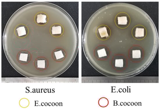 The antimicrobial activity of the cocoon was tested against Escherichia coli and Staphylococcus aureus using a shaking flask method according to GB/T 20944.1 (China). E. coli dh5α and S. aureus were cultured in Luria–Bertani (LB) medium (220 rpm, 37 °C). Bacteria solution with a cell concentration of 1 × 108 cfu/mL and OD600 of 0.6 was mixed with melted LB solid medium at a volume ratio of 1:1000. Then, 10 mL of mixed culture medium was poured into each petri dish (90 mm in diameter). A picture was taken after cocoon samples were added to the petri dish for 24 h at 37 °C.