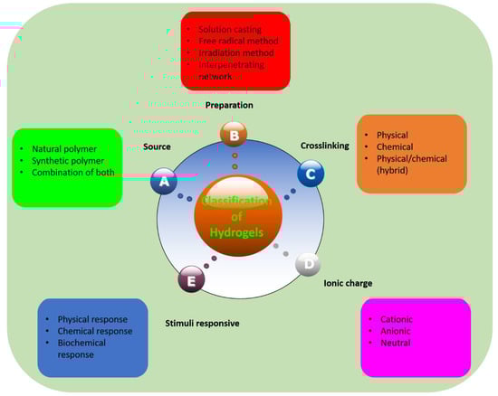 Hydrogels can be classified based on different factors and their classification is summed up briefly in Figure 1. Classification of hydrogels depends on the materials (polymers) involved, the source of the polymers, the crosslinking method, their response to stimuli, and their ionic charge. Polymers involved in the hydrogels are natural, synthetic, or combination of natural and synthetic polymers. These polymers can form hydrogels as homopolymer hydrogels, copolymer hydrogels, block copolymer hydrogels, terpolymers, and so on. Moreover, hydrogels are prepared by crosslinking polymers and the crosslinking can be physical, chemical, or both, simultaneously. Crosslinking is formed is numerous ways as well, such as simple mixing, solution casting, bulk polymerization, free radical polymerization, UV and gamma irradiation, and interpenetrating network formation method. Hydrogels can also be classified, based on ionic charge, as cationic, anionic, and neutral hydrogels. The charge on the overall network depends on the charge on the polymer.