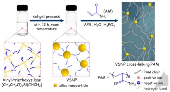 Preparation of vinyl hybrid silica nanoparticles (VSNPs) from vinyl-triethoxysilane nanoparticles followed by the synthesis of VSNP-PAM from VSNPs (crosslinking agent), ammonium persulfate (APS, initiator), acrylamide (AM, main monomer), and phosphoric acid (proton source) [11].