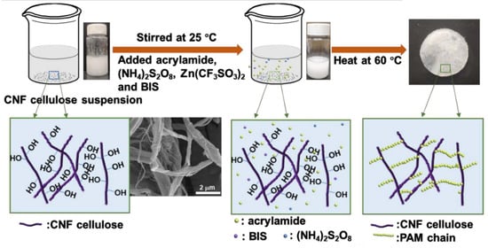 Xu et al. reported poly (acrylamide) hydrogel membranes grafted over cellulose nanofibers (CNFs) crosslinked through N, N′-methylenebisacrylamide via free radical mechanism. The grafting was owing to the interconnection of amide group of poly (acrylamide) and hydroxyl and carboxyl groups present on the surface of CNFs (Figure 4) [40].