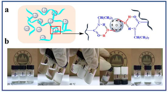 (a) Synthesis mechanism of poly (N-isopropylacrylamide)/mesoporous silica nanoparticle (PNIPAM/MSN) composite hydrogels; (b) digital photographs showing the PNIPAM/MSN-0, PNIPAM/MSN-1, and PNIPAM/MSN-5 hydrogels at 20 °C and 40 °C [48].