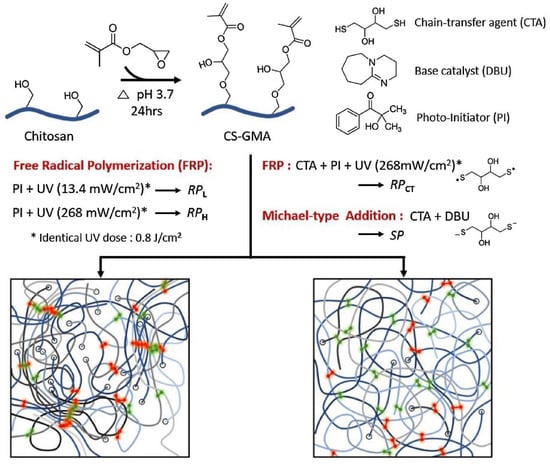 Hydrogels have been prepared through light-sensitive functional groups. This technique has significant advantages, such as ease, speedy preparation, and low cost of production compared to chemical crosslinking methods. Ono et al. reported UV-light-irradiated chitosan hydrogels by introducing azide and lactose as light-sensitive moieties. Azide group converted into nitrene group after UV irradiation, which bound to amino groups of chitosan to form a hydrogel in a short time [86]. Other UV-irradiated chitosan hydrogels were prepared by pre-functionalization with photo-sensitive acrylates of chitosan and pluronic acid [87]. Recently, methacrylate-functionalized chitosan hydrogels have been reported using a UV light by step growth or chain-growth polymerization using dithiothreitol (DTT). Furthermore, 2-hydroxy-2-methylpropiophenone and UV LED (365 nm) changing power density, 13.4 or 268 mW/cm2, were used as the photo initiator and source of radiation, respectively. Chitosan hydrogels formed by photo-initiated free radical polymerization (FRP) were designated as RP, and the subscripts L or H were used to indicate low (13.4 mW/cm2, 60 s) or high (268 mW/cm2, 3 s) UV intensity used to initiate FRP. The subscript CT indicated the use of the chain-transfer agent dithiothreitol (DTT) during FRP. Chitosan hydrogels formed by step polymerization via a base-catalyzed thiol-ene reaction were termed SP. The hydrogel synthesis method is shown in Figure 7 [88].