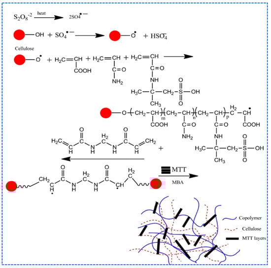 Bao et al. reported superabsorbent hydrogels of sodium carboxymethyl cellulose-graft-poly (acrylamide-co-acrylic acid-co-2-acrylamido-2-methyl-1-propanesulfonic acid (AMPS))/montmorillonite (MMT)) using KPS and MBA as an initiator and a crosslinking agent, respectively. These super porous hydrogels contained porous networks owing to MMT and carboxymethyl cellulose, with side chains carrying carboxamide, carboxylate, and sulfate. The swelling ratio of the hydrogels exhibited high external pH sensitivity. The hydrogels showed swelling ratios in the following order in the presence of salt solutions: K+ > Na+ > Ca2+ > Mg2+. The plausible mechanism of hydrogel synthesis is shown in Figure 8 [95].