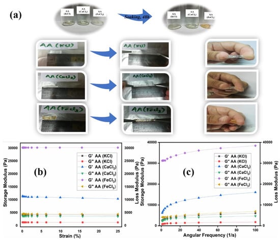 Similarly, other polymers, such as sodium alginate and xanthan gum, can interact ionically with Fe3+ ions to form hydrogel networks [75,76]. Although one may also form hydrogels in the absence of salt solutions, hydrogels without metal ions are relatively weaker than hydrogels formed in the existence of metal ions [77].