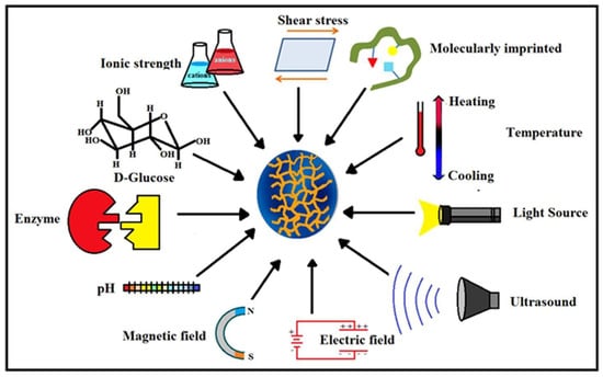 Hydrogels show different responses to changes in environmental stimuli, which may generally be categorized into (i) physical (temperature, light, etc.), (ii) chemical (pH and ionic strength), and (iii) biological (enzymes) stimuli. Chemical and biological stimuli are internal, whereas physical stimuli are external, except for temperature, which may be external or internal. Besides all this, there is a special type of stimulus-responsive smart hydrogel called shape memory hydrogel, with two characteristics: (i) permanent shape and (ii) a chemical or physical code that can help restore its original shape [128].