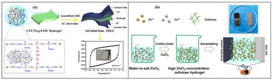 Recently, hydrogels attained striking attention for energy storage and conversion applications owing to their semi-solid phase and inherent flexibility. Traditional energy storage and conversion devices suffer from heavy weight, mechanical rigidity, and unsustainability. Additionally, there is another issue of device leakage because commercially available devices contain liquid electrolytes. Liquid electrolytes are expensive and harmful to human beings due to their organic nature. Therefore, hydrogel electrolytes have been introduced into these devices. Hydrogel electrolytes are semi-solid, biocompatible, biodegradable, cost-effective, and environmentally friendly. These characteristics, along with the inherent flexibility, are indispensable towards practical applications in energy storage devices, especially supercapacitors [11]. Electrochemical devices using hydrogels become flexible, stretchable, and elastic and can work under stretching, bending, folding, and twisting. These characteristics are seriously devastating over traditional electrochemical devices. Furthermore, hydrogels are self-healable, which is a critical element for wearable and portable electronic devices. Self-healability or damage management ability makes the devices ideal for smart and light-weight electronics [12,13].