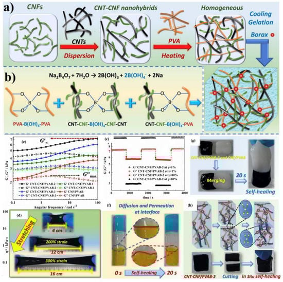 - Han, J.; Wang, H.; Yue, Y.; Mei, C.; Chen, J.; Huang, C.; Wu, Q.; Xu, X. A self-healable and highly flexible supercapacitor integrated by dynamically cross-linked electro-conductive hydrogels based on nanocellulose-templated carbon nanotubes embedded in a viscoelastic polymer network. Carbon 2019, 149, 1–18. [Google Scholar] [CrossRef]