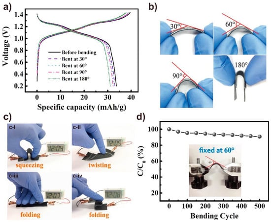 - Liu, Z.; Li, H.; Zhu, M.; Huang, Y.; Tang, Z.; Pei, Z.; Wang, Z.; Shi, Z.; Liu, J.; Huang, Y. Towards wearable electronic devices: A quasi-solid-state aqueous lithium-ion battery with outstanding stability, flexibility, safety and breathability. Nano Energy 2018, 44, 164–173. [Google Scholar] [CrossRef]