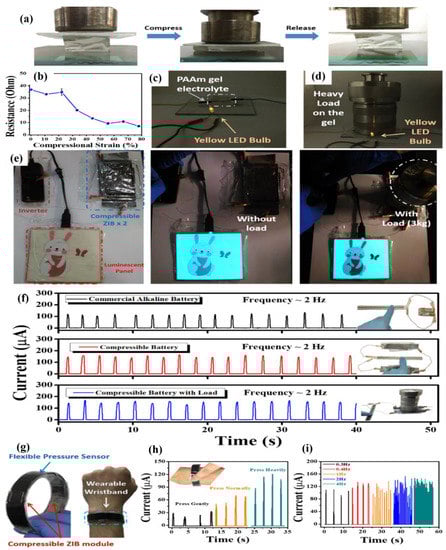 - Wang, Z.; Mo, F.; Ma, L.; Yang, Q.; Liang, G.; Liu, Z.; Li, H.; Li, N.; Zhang, H.; Zhi, C. Highly Compressible Cross-Linked Polyacrylamide Hydrogel-Enabled Compressible Zn–MnO2 Battery and a Flexible Battery–Sensor System. ACS Appl. Mater. Interfaces 2018, 10, 44527–44534. [Google Scholar] [CrossRef] [PubMed]