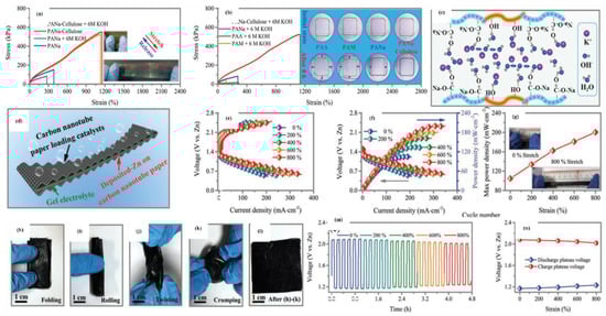 - Ma, L.; Chen, S.; Wang, D.; Yang, Q.; Mo, F.; Liang, G.; Li, N.; Zhang, H.; Zapien, J.A.; Zhi, C. Super-Stretchable Zinc–Air Batteries Based on an Alkaline-Tolerant Dual-Network Hydrogel Electrolyte. Adv. Energy Mater. 2019, 9, 1803046. [Google Scholar] [CrossRef]